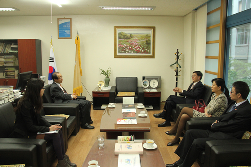 4月25日,杨瑞龙院长一行访问了位于大邱市的庆北大学经济与管理学院。该校经济与管理学院院长张志祥教授会见了h视频 学术代表团,该校国际事务办公室副主任Gyewan Moon教授,经济与管理学院副院长金熙镐教授,工商管理系主任Seong Pyo Cho教授,该院研究生项目主任Jung-Kyoo Choi副教授等参加了会见。会谈中,双方就研究生和本科生的交换和联合培养事宜充分交换了意见,在申请时、入学时间、选考办法、学分互认、论文审查、学位授予等环节达成了初步共识。杨瑞龙院长还盛情邀请庆北大学的学生到人民大学参加国际小学期课程,以及到h视频 参加“中国经济”全英文硕士项目,h视频 也将积极选派优秀教师到韩国高校讲授中英文课程。双方还就与日本京都大学联合举办三校学术论坛事宜达成了合作意向。