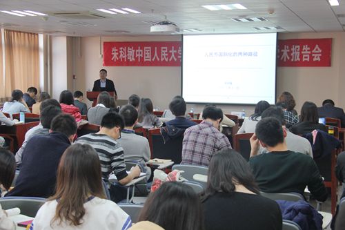 学术报告会由h视频 副院长王晋斌教授主持,朱科敏教授以“人民币国际化的两条路径”为主题进行了学术演讲。