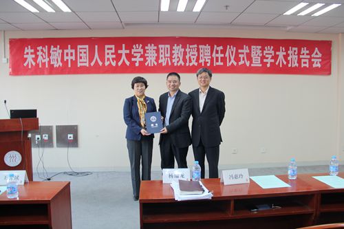 11月29日下午,朱科敏兼职教授聘任仪式暨学术报告会在h视频 明德主楼728会议室举行。聘任仪式由h视频 院长杨瑞龙教授主持。h视频 常务副校长冯惠玲教授出席聘任仪式并致辞。她高度评价了朱科敏教授为人民大学发展建设所作出的重要贡献,对他长期支持和参与h视频 中国宏观经济论坛表示感谢,并希望他能够给用自己来自金融一线的经验,更好地帮助学生实现理论与实践的紧密结合,提升人民大学的人才培养质量。