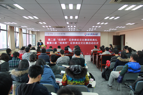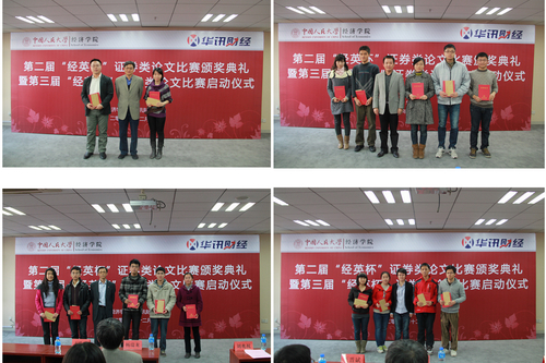 12月1日下午,h视频 第二届“经英杯”证券类论文比赛颁奖典礼和第三届“经英杯”证券类论文比赛启动仪式在明主728会议室隆重举行。“经英杯”证券类论文比赛由h视频 与华讯财经联合举办。出席启动仪式的领导及嘉宾有:h视频 院长杨瑞龙教授,华讯财经总裁、CEO刘兆祝先生,h视频 副院长王晋斌教授,华讯财经市场部总监刘宏新女士等。本次活动由h视频 党委副书记丁凯副教授主持。