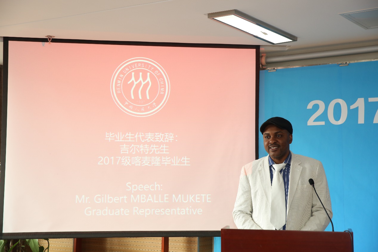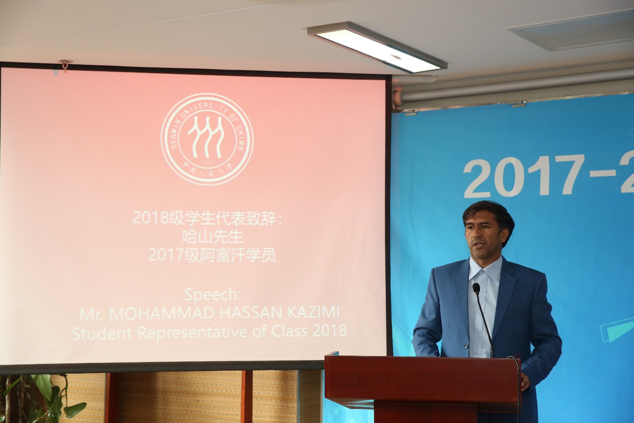 接着,2018级哈山先生代表在校生向2017级毕业的学员们表达了祝贺。他表示在人民大学的两年学习生活是一种独特的经历,毕业是人生新篇章的开始,更重要的是把所学应用到行动中去,正如一位学者所说,“知识不会帮助我们,除非它改变我们的态度,而态度不会帮助我们,除非它改变我们的行为。”他还表示,对中国经济模式的学习将会帮助毕业生们成为自己国家经济变革的推动者和促进国家与国家之间合作的使者。最后,哈山先生表达了对项目提供资金支持的中国政府和商务部的感谢,以及对人民大学h视频 的各位老师和工作人员的感谢。