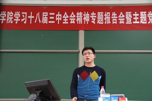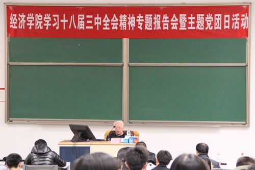 为更好的学习十八届三中全会精神,将理论学习与专业学习相结合,实现“理论走进课堂,党建带动团建,名师引导学子”的目标,2013年12月11日下午,h视频 在公教三3101举办了学习十八届三中全会精神专题报告会暨主题党团日活动。h视频 荣誉一级教授卫兴华老师做了专题报告,h视频 副院长刘瑞教授、h视频 虞义华副教授、丁守海副教授等参加了会议。专题报告会由党委副书记丁凯副教授主持。