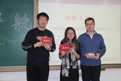 张鹏校友从他的职场历程角度和我们分享了他的宝贵经验,他建议在校同学抓住暑期实习的机会,为找工作积累经验;在找工作的同时注意自我学习,不断提升自身能力。找工作要对自己有明确定位,不要盲目跟风,工作要与性别、性格特点相契合,要根据自己的定位来选择自己的职业和发展平台。