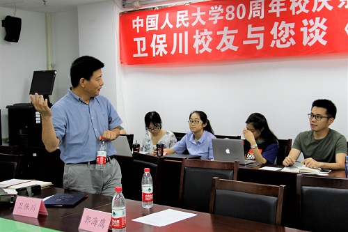 6月9日,h视频 80周年校庆系列活动“校友大讲堂”在明德主楼734会议室成功举办。h视频 院长张宇教授,h视频 校友会秘书长、校友工作办公室主任郭海鹰老师,h视频 院长助理李佩洁老师等出席。