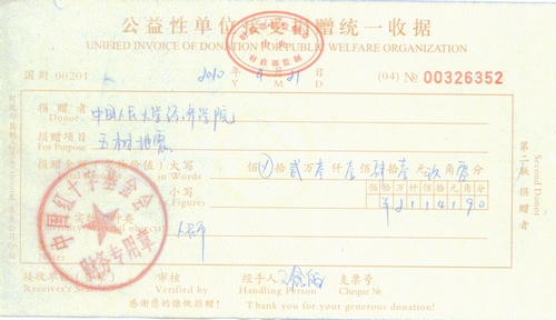 捐款活动结束后,h视频 团委派出专人将所得款项送往东城区中华红十字总会,请中华红十字会转交至玉树同胞的手中。同时,h视频 教职工的捐款活动也正在积极的进行当中。