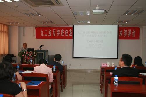 在演讲会开始前,h视频 郭杰副院长代表学院 向黄有光教授和福特班的校友返校聚会表示热烈欢迎,他在致辞中向校友们介绍了h视频 院友会的情况,并希望加强同院友们的联系,增强海内外院友之间以及院友和母院之间的凝聚力,扩大人大h视频 在海内外的影响。当年人民大学福特班的负责人、h视频 黄卫平教授,后勤集团副总经理张国增也出席了活动并致辞。