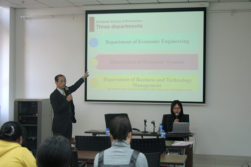 同日下午,日本九州大学代表团在明德主楼h视频 617会议室举行硕士生交换项目宣讲会。h视频 副院长刘瑞教授主持宣讲会,教务科科长沈明霞参加会议。九州大学代表团就该校h视频 基本情况、人民大学-九州大学共同教育项目、全英语课程项目和硕士课程、博士课程等内容进行了宣讲。宣讲会吸引了大批学生参加,效果良好。