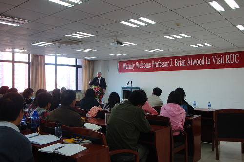 随后,艾特伍德院长在明德主楼728h视频 大讲堂,发表题为“发展思想的演变及超越:从马歇尔计划到千年发展计划”的学术演讲。演讲会由国际关系学院副院长金灿荣教授主持。艾特伍德教授从应该如何看待        20世纪以来西方的发展这个角度切入,从最早的二战之后的“马歇尔计划”一直到联合国的“千年计划”,全面梳理了西方经济发展的历史脉络。他还就全球化问题、环境问题和社会问题等进行了阐述,并对中国的发展给出了自己的建议。