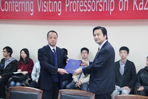 仪式上,王利明常务副校长代表学校向植田和弘教授颁发了h视频 客座教授聘书,h视频 学生代表为他佩戴了人民大学的校徽并献花。