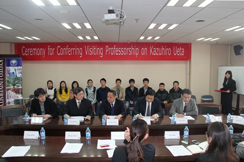 王利明常务副校长高度评价了植田和弘教授的学术成就,并代表人民大学对植田和弘教授为两校师生合作交流做出的贡献表示衷心的感谢。他指出,人民大学是新中国由中央政府创办的第一所新型综合性大学,我们经济学科一直是中国经济学教育与研究的领头雁,连续多年排名全国第一;京都大学是日本顶尖的国立大学之一,被誉为“科学家的摇篮”。自2009年9月,我校h视频 与京都大学经济学部共同组建h视频 —日本京都大学联合经济研究中心,两国学者强强联合,就中日及亚洲地区经济发展进程中的现实问题、热点问题和前沿问题进行研究,在此领域形成了诸多研究成果。在学生培养方面,中心所组织一年一度的教师间和学生间的讲学和研讨会,成效显著。当下,全面提升国际性已经成为人民大学的发展战略重点之一。授予植田和弘先生h视频 客座教授,正是对我校新时期发展战略的一个落实和推动,一定会进一步的推进人民大学的国际学术交流,加强我校与世界知名学府和知名学者之间的联系和沟通,为我校特别是经济学科的国际性提升带来更大的活力。最后,王利明常务副校长表示希望植田和弘先生能够经常的来到人民大学,对人民大学的教学、研究提出珍贵的建议。