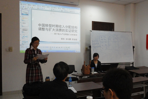 10月12日,第30期研究生学术论坛邀请了宏观经济理论教研室的夏明副教授作点评人,h视频 国民经济学专业2010级硕士陈淑霞同学就《中国转型时期收入分配结构调整与扩大消费的实证研究——基于投入产出两部门分析框架》做了学术演讲。