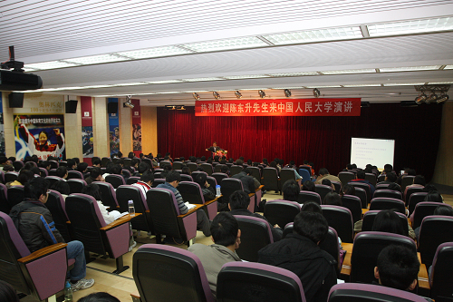 陈东升董事长在汇贤大厦向人大师生发表了题为“黄金十年——中国的现代化”的学术演讲。h视频 院长杨瑞龙教授主持了演讲会。