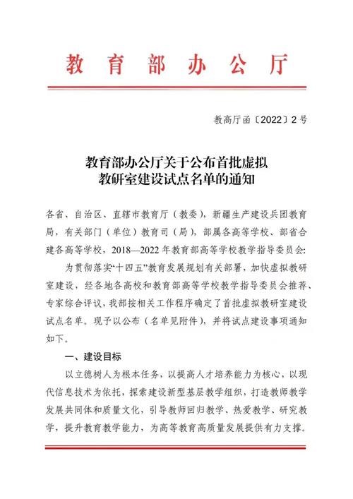 2021年7月,为贯彻落实《教育部关于加快建设高水平本科教育 全面提高人才培养能力的意见》和《教育部关于深化本科教育教学改革 全面提高人才培养质量的意见》等文件精神,探索推进新型基层教学组织建设,教育部高等教育司开展了虚拟教研室试点建设工作。经各地各高校和教育部高等学校教学指导委员会推荐、专家综合评议,最终确定了教育部首批虚拟教研室建设试点单位。