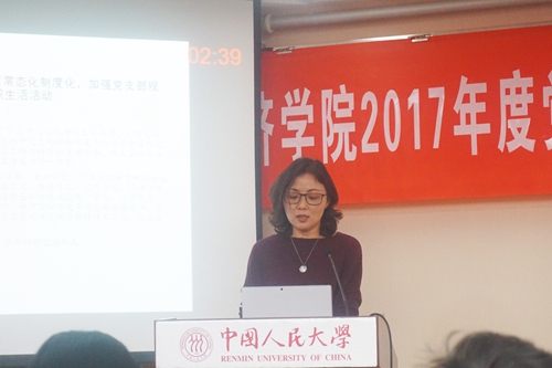 会议最后,学院党委书记关雪凌作总结发言。她指出,党的十九大以来,党建工作重要性日益突出。目前,高校基层党支部建设工作还存在很多问题,党建工作水平亟待提高,因此学校和学院党委高度重视基层党支部建设工作。她表示,在过去一年中,各位党支部书记都能够积极开展工作,但是仍有部分工作没有落实到位,希望党支部书记能够以这次会议为动力,将支部工作抓实抓好、抓出实效。关雪凌书记还结合各党支书述职汇报的具体情况和各党支部的共性问题提出三点希望。一是进一步统一思想,厘清基层党建工作责任主体;二是以身作则,扎实推进“两学一做”学习教育常态化、制度化,严肃党内政治生活;三是积极探索,勇于创新,开创具有支部特色的基层党建工作模式。