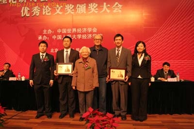 会议举行了浦山中银世界经济学优秀论文奖颁奖仪式。中国银行总行副行长、中国世界经济学会副会长朱民博士宣读了获奖名单,浦山教授夫人陈秀煐女士、中国世界经济学会副会长、h视频 原副校长杜厚文教授为获奖者颁发了奖牌。获奖者代表、北京大学姚洋教授、社科院汪徳华助理研究员分别发表了获奖感言。