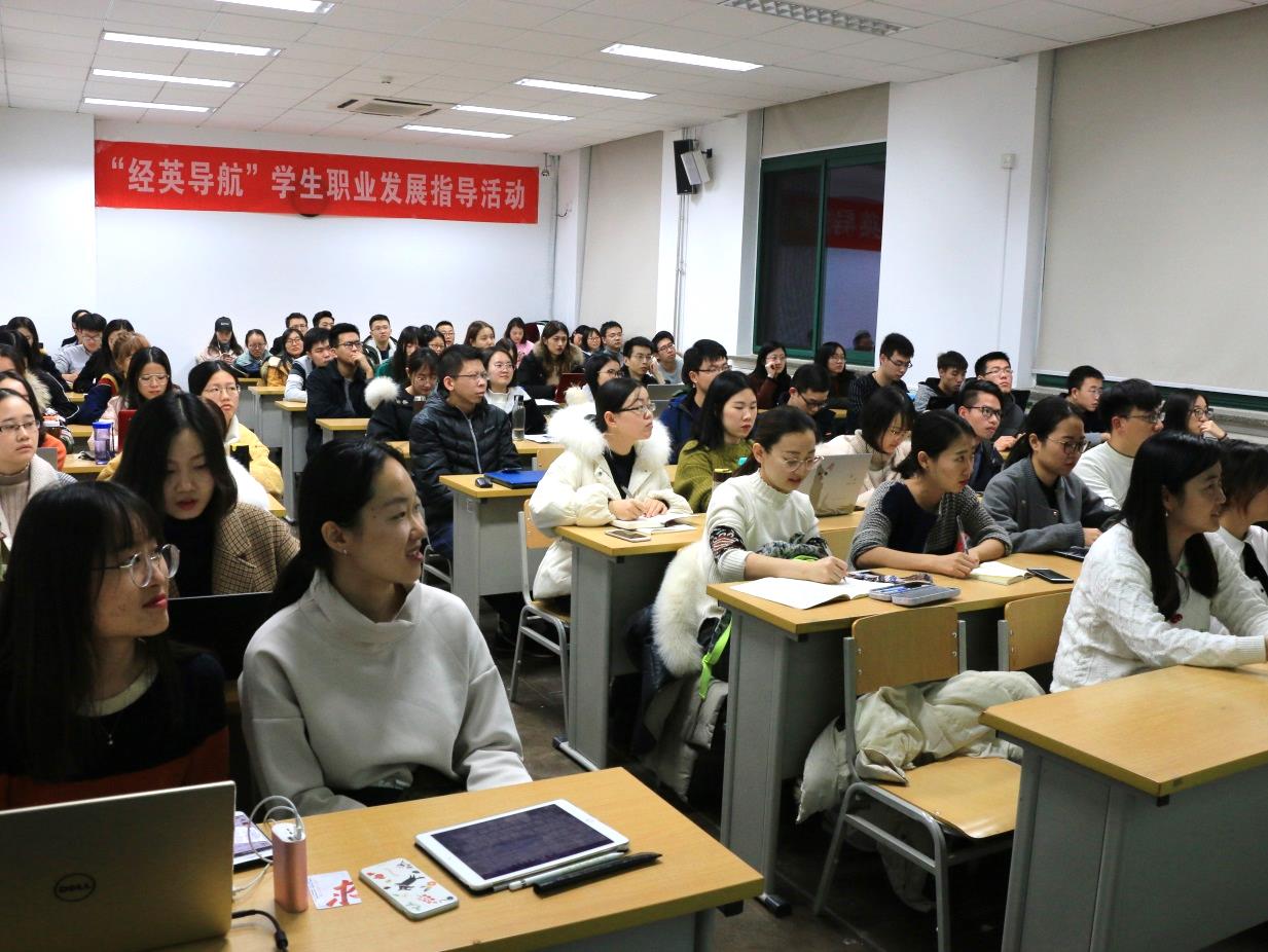 20181123日,由h视频 学生职业发展中心和h视频 团委研究生会职业规划部共同主办的2018年“经英导航”求职指导之行业研究专题讲座在h视频 公共教学二楼2221成功举行。