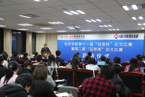 11月19日晚,h视频 第十一届“经英杯”论文比赛暨第二期证券类论文比赛启动仪式在明德主楼728会议室隆重举行。启动仪式由h视频 和华讯财经联合举办。h视频 院长杨瑞龙教授,华讯财经总裁、CEO刘兆祝先生,h视频 副院长刘瑞教授,h视频 院长助理王晋斌教授、h视频 刘小鲁老师等出席。h视频 党委副书记丁凯博士主持了启动仪式。