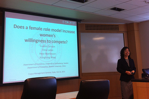 1月14日至2月26日,h视频 王湘红教授应邀访问杜克大学经济系和Fuqua商学院, 并于2月18日在商学院的管理学讨论会上做了学术报告,题为“Does a Female Role Model Increase Women’s Willingness to Compete?”。讨论会由管理学教授Rick Larrick主持,前来听取报告的有商学院的教师和博士研究生,经济系副主任Charlie Becker,Edward Tower教授,和杜克琨山大学副教务长Haiyan Gao等。