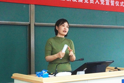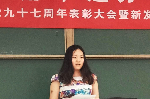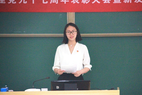 年度新发展党员代表冯晗芮就自己成为一名光荣共产党员的心路历程进行发言。她表示,作为一名党员,要把入党誓词作为终身追求,坚定理想信念、加强理论学习、争当先锋模范,让见贤思齐成为一种习惯,让党员的先锋模范作用在生活中不断显现出来,争做国民表率、社会栋梁。