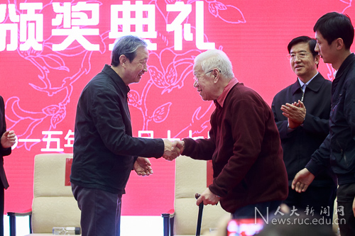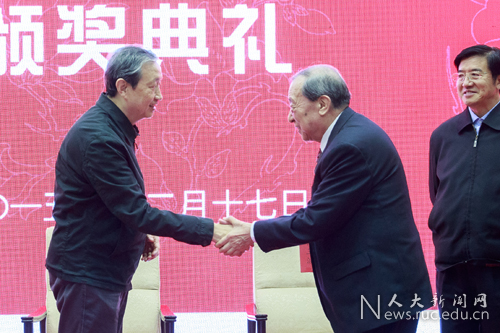12月17日下午,第四届吴玉章人文社会科学终身成就奖在h视频 世纪馆颁奖。著名经济学家、h视频 荣誉一级教授卫兴华先生以及著名历史学家、古文字学专家、清华大学李学勤教授获得此届终身成就奖。中共中央政治局委员、国务院副总理、吴玉章基金委员会主任马凯为获奖者颁奖并讲话。教育部副部长杜玉波,清华大学党委书记陈旭,h视频 党委书记靳诺、校长刘伟,吴玉章基金委员会委员黄达、顾海良、马绍孟、程天权、方汉奇、刘大椿、张东刚,h视频 党委常务副书记张建明、常务副校长王利明、副校长查显友、副校长伊志宏、副书记吴付来、副校长洪大用,学者代表邬沧萍、林岗以及兄弟院校代表等出席典礼,共同见证这一时刻。