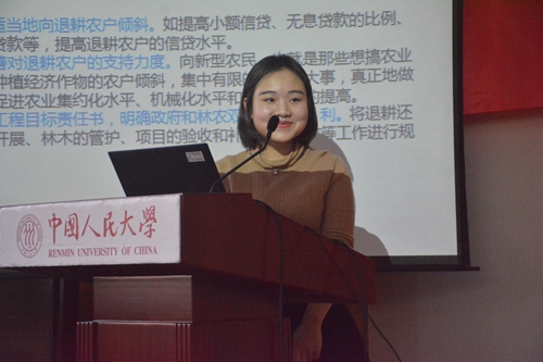 最后,翟一柠同学上台展示了题为《易地扶贫搬迁背景下居民留守选择的影响因素分析——基于黔西南普安县地瓜镇的实地研究》的报告,从研究背景、研究思路、研究内容以及最后成果四个方面介绍了关于异地扶贫搬迁的调研成果。