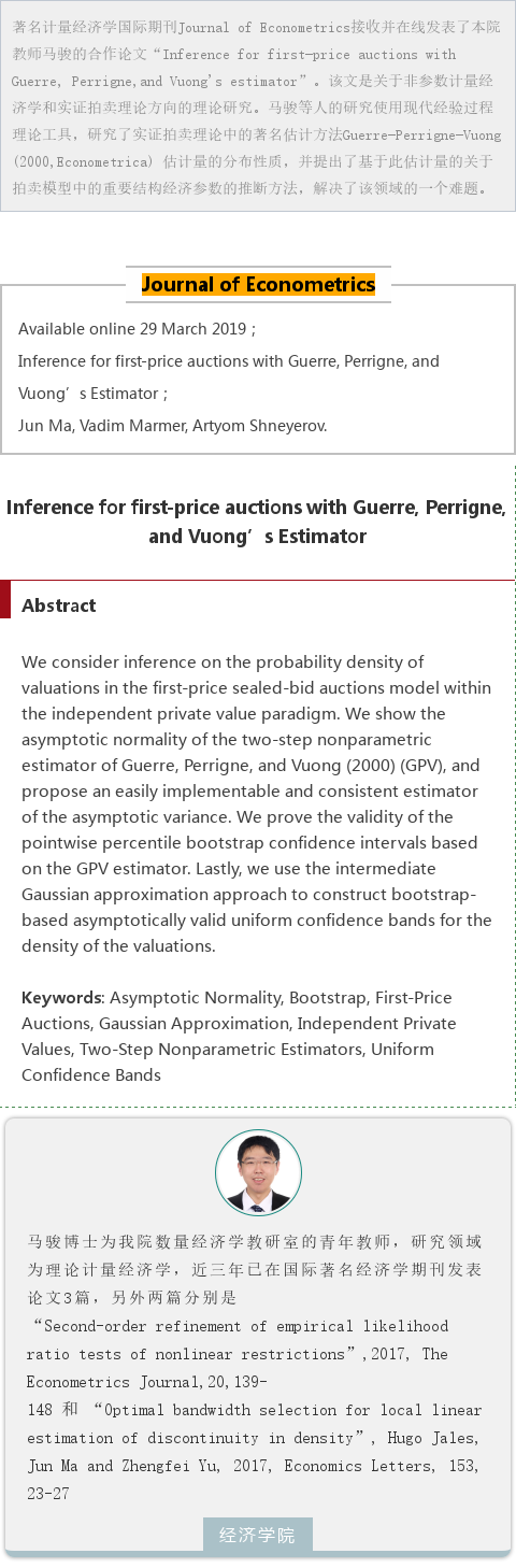 人大h视频 青年教师马骏论文被国际顶刊计量经济学杂志(Journal of Econometrics)接收