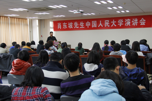 11月8日中午,h视频 经英领航之底蕴教育系列活动“尊礼,感恩,宽容——青年人的修身之道”讲座在明德主楼728举行。CCTV七频道主持人、第七届感动中国十大风云人物奖得主、首都爱心助残慈善大使肖东坡先生应邀出席并带来精彩讲座。h视频 院长杨瑞龙教授主持讲座。