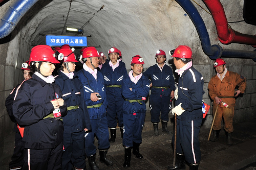 许疃煤矿属于淮北市淮北矿业集团下属的一座现代化大型生产矿井,总投资8.2亿元,年生产能力350万吨,是淮北矿区产量最大的一对矿井。在许疃煤矿,郑新业教授一行与矿长韩流、党委书记姚中华及其他主要领导进行了会谈。会谈中许疃煤矿对企业的经营历史和发展现状进行介绍,郑新业教授与许疃煤矿领导对我国煤炭生产及消费形势进行了深入分析,并提出h视频 能源经济系在许疃煤矿建立本科生实习基地的合作意愿,在会谈中双方就未来的合作计划进行了深入的交流。次日,师生代表团在矿长韩流的陪同下亲自到地下520米深处的矿井参观,真实的感受了井下的环境、设备管理、矿工操作、井下设备维护等生产活动细节。