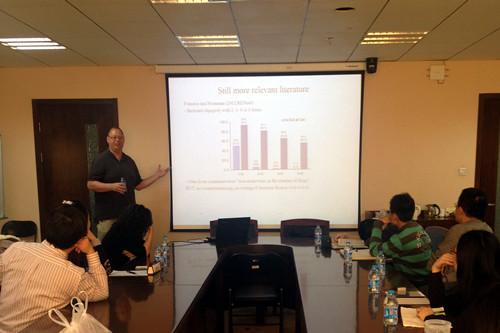 12月19日中午,h视频 第二十七期发展经济学研讨会在明德主楼734会议室举行,澳大利亚Monash大学的Nick Feltovich教授报告了“群体大小如何影响交流效果——来自公共品实验的证据”。h视频 王湘红教授、孙文凯副教授、叶茂亮博士、刘凯博士以及包括h视频 在内各个学院的部分博士、硕士研究生参与了会议。