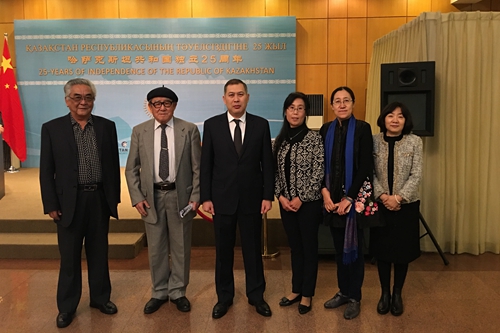 活动开始前,在“一带一路”经济研究院首席顾问、著名的中亚问题专家胡振华教授带领下三位研究员首先拜会了哈萨克斯坦驻华大使努雷舍夫先生,并与大使馆的参赞凯拉提先生以及使馆其他工作人员互致问候并进行了亲切的交谈。一方面向努雷舍夫大使及哈萨克斯坦在华人员对哈萨克斯坦共和国独立25周年表示衷心的祝贺,同时就使馆及大使先生对h视频 “一带一路”经济研究院9月11-16日赴哈萨克斯坦进行学术交流活动所给予的支持表达最诚挚的谢意,并交流了访问团与哈萨克斯坦法拉比大学和欧亚大学的学术合作成果。努雷舍夫大使请三位老师转达对h视频 “一带一路”经济研究院派代表特意来参加哈大使馆的庆祝活动表示感谢。