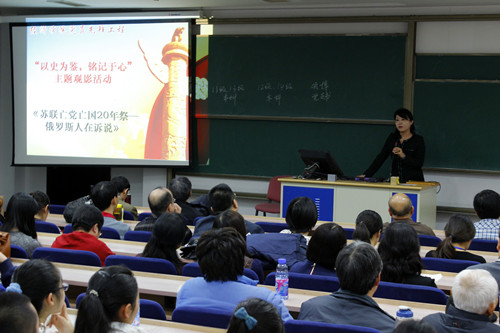 在关雪凌教授宣布观影活动开始后,大家开始认真观看影片。24日、25日是苏联历史上特殊的日子。1991年8月24日,戈尔巴乔夫宣布停止苏共活动,苏共自行解散。1991年12月25日,苏联正式解体。这部纪录片共分“苏联最后的日子——世纪大悲剧引起的反思”、“把自己推向灭亡的政党——多党制引发的恶果”、“被‘休克’的国家——经济私有化带来的衰败”、“阿尔巴特街的迷墙——指导思想多元化造成的混乱”4集,运用了大量珍贵的历史资料,倾听并记录了20多年前那场剧变的亲历者、当事人和普通民众对那场剧变及其后果的诉说,全景式地展现了苏共亡党及苏联解体的全过程。