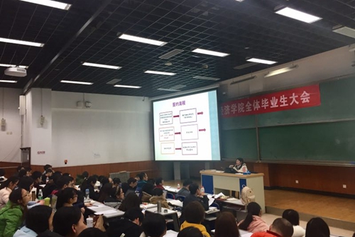 随后学生职业发展中心主任撒莉老师为同学们逐条详细讲解了就业的详细事宜、政策等。撒莉老师首先为同学们介绍了过去两年毕业生的总体去向,经院毕业生在2017、2016年就业率均为100%,虽然就业形势一年比一年严峻,但是h视频 的就业形势在全校中排名前列,学生总体就业质量良好,就业单位与去向均在全校中拔得头筹。撒莉老师鼓励大家积极乐观对待求职,树立“先就业后择业”的就业观。介绍了就业信息来源,就业渠道的获取,以及详细讲解就业信息网的使用,指导就业推荐表的填写,梳理了就业协议和劳动合同的签订流程,以及报到证的用途等等。此外,撒莉老师也细致地解答了往年同学们出现疑问较多的户籍、档案、组织关系等问题,并提醒同学们注意人身、财产、交通安全,放平心态,互相理解包容,学生与学院老师相互配合,顺利度过这一年的求职季,做到学业与事业的双丰收。