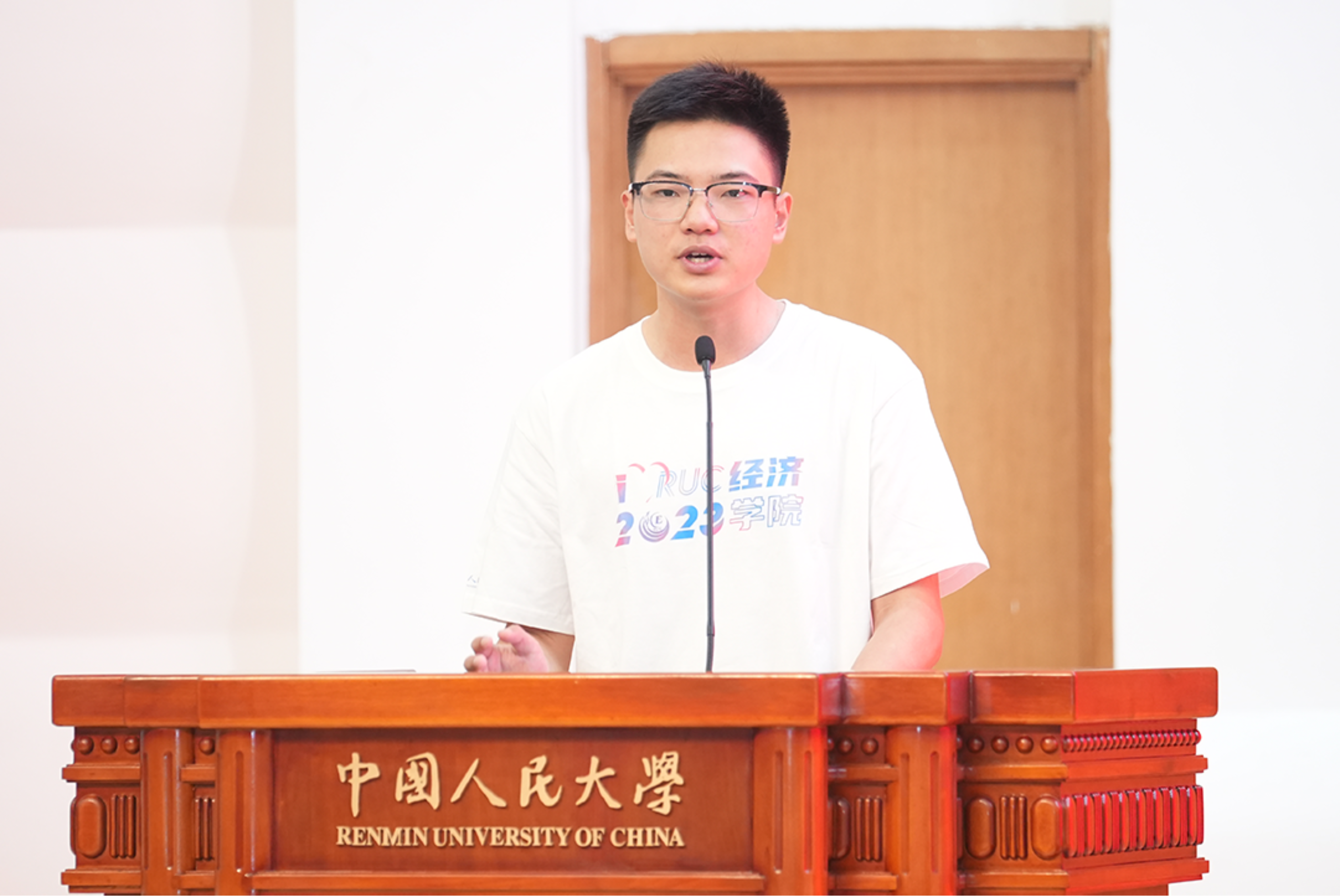 2023级政治经济学专业硕士生江瑾贤作为研究生新生代表发言,他讲述了自己本科期间在经院学习经济学的经历和感受:在丰富多彩的课堂上感受学习经济学的魅力,在不同流派的理论中体验思想的激烈碰撞,在深入生活的研究中感悟经世济民的情怀,在行走中国的实践中习得知行合一、学以致用的可贵品质。