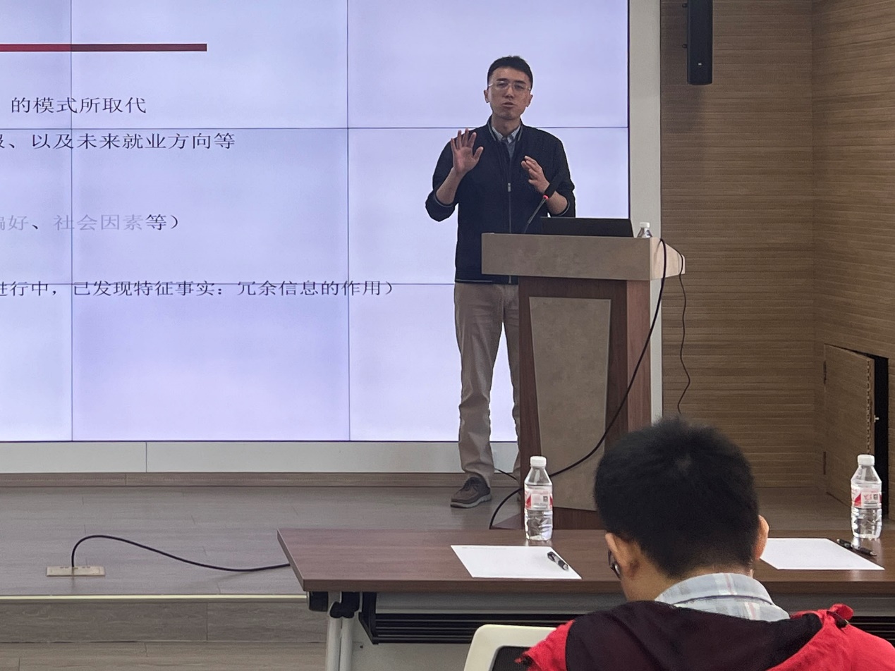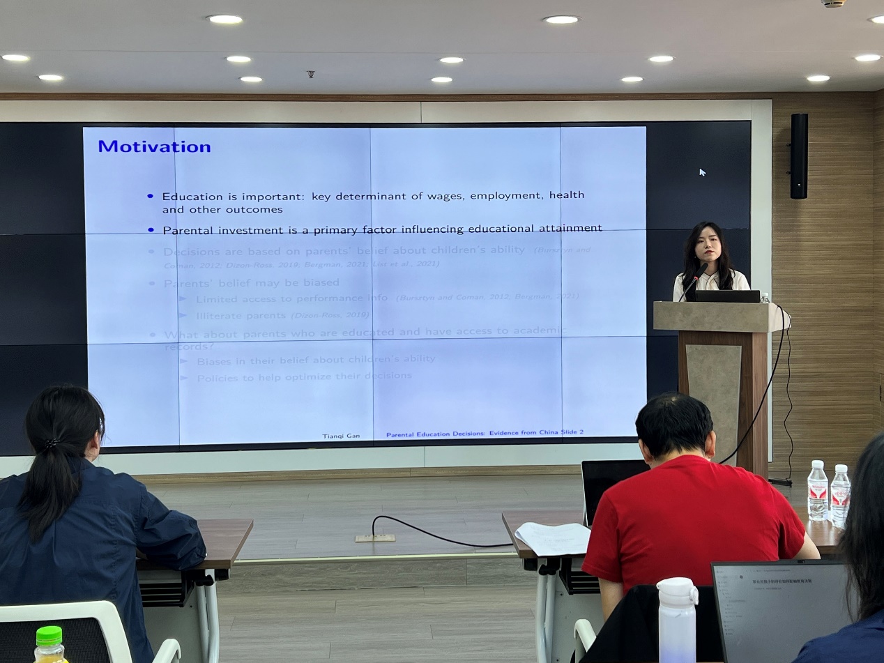 苗彬的报告题目为“教育实地实验研究的最新进展”。依托学院在实验基地与中等学校建立的长期联系,目前正在从行为经济学视角开展对新高考改革当中学生选科行为影响因素的研究。高考政策随着时代的发展不断的改革和调整,新高考的“6选3”或者“7选3”模式涉及的科目选择,影响学生大学录取、专业填报、以及未来就业方向等。研究发现学生选科行为受信念、偏好、社会因素等多方面影响。他主要分享了针对信念这一因素影响科目选择的实验设计思路和机制分析过程,阐述了研究中的随机干预方法,并解读了研究发现的过度自信的现象。
