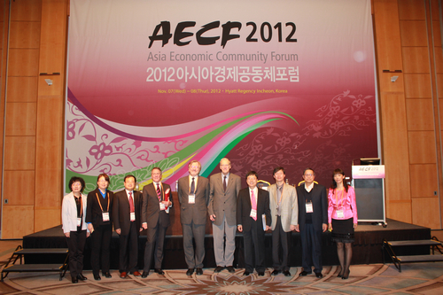 11月7-8日,第四届亚洲经济共同体论坛(AECF)在韩国仁川举行,此次大会的主题是“亚洲的未来与共同体建设”。会议由亚洲经济共同体论坛基金会主办,来自韩国的学术团体如仁川大学东北亚发展研究院、韩国东北亚经济学会和韩中社会科学学会等,来自中国的如中国宏观经济管理教育学会和吉林省社会科学院等,来自日本的如日本比较经济学会等,以及欧亚各国学者等出席会议。论坛得到韩国重要研究机构和财团支持,共计200多名代表出席了本次会议。中国宏观经济管理教育学会会长、h视频 副院长刘瑞教授率领中国宏观经济管理教育学会代表团出席本次论坛,代表团成员有刘明副会长(陕西师范大学教授),李惠茹副秘书长(河北大学教授)、曹华常务理事(云南民族大学教授),王千红常务理事(东华大学教授)。