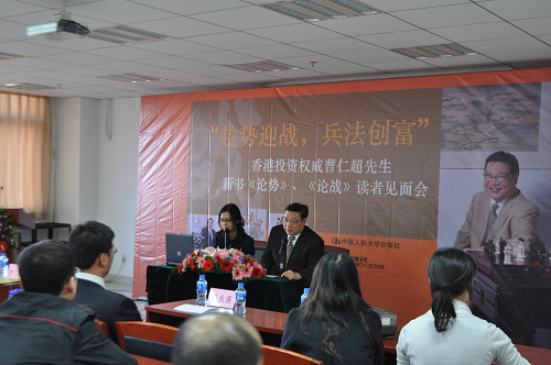 首先, 曹仁超先生用其多年的成功投资经验和高超的分析技巧对未来的中国股市进行了理性的分析,做出了乐观的预测,鼓舞了与会者的投资信心;随后,他与现场听众分享了他的成功历程和投资心得;最后, 曹先生还向热情读者在他的新作《论战》一书上签名留念。