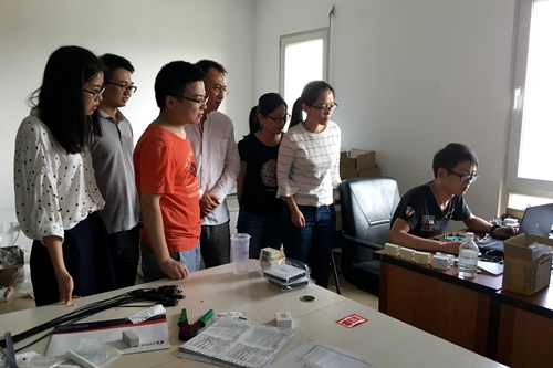 座谈期间,调研团还切身体验了一次客流量计数设备的使用过程,将设备绑定微信,打开微信-查看我的设备选项,即可看到绑定设备所测定的人流量变化。这一功能得以实现的便利性,让调研团纷纷惊叹不已。随后,调研团队徜徉于企业产品的产品展览馆、研发团队工作室,惊叹于高新技术的神奇,见证了从小小的电子元器件到红外线检测设备、Wi-Fi探针等高新技术设备的变化过程。