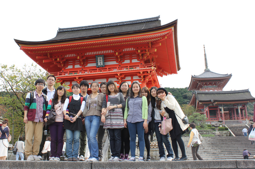 10月22日上午,h视频 学生在日本同志社大学同学的陪同下,参观了日本著名古迹清水寺和八坂神社,并沿途观光了富有日本传统特色的古街道。同志社大学的同学一路上详细地为经院学生介绍日本的相关文化。同学们亲身地感受了日本的传统历史文化。下午,经院学生还游览了京都的市中心,并在日本同学的讲解下,了解到一些日本的社会经济情况。