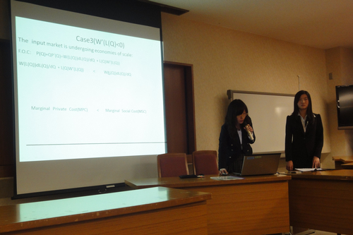 在与京都大学学生的学术交流会上,h视频 的罗章最、叶柏川、张凌云、张璇和日方Nanaho Yamanaka,Jung Sung-Woong 同学分别用英文宣讲了论文,并分别由Atsushi、 RyoKanae、宋丹和聂玉琼做出评论。讨论会在认真友好的氛围中进行。会后,京都大学的学生纷纷表示,中国学生流利的英文表达以及分析经济学的新颖视角给他们留下了深刻印象。