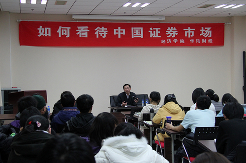 12月17日,由h视频 和华讯财经联合举办的“证券市场理论与实务”系列讲座之首场讲座“如何看待中国证券市场”在明德主楼617举办。讲座由h视频 副院长郭杰教授主讲,h视频 团委书记王宝奎主持。