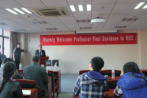 在Davidson教授开始报告之前,h视频 院长杨瑞龙教授会见了Davidson教授,h视频 邱海平教授、谢富胜教授等参加了会见。杨瑞龙院长首先代表学院对Davidson教授的来访表示热烈欢迎,并简短介绍了h视频 的学科设置、h视频 优势和社会影响等,并邀请Davidson教授在方便的时候专程访问h视频 。杨斌副教授、于泽副教授、赵峰副教授、张晨博士和许准博士等参加了报告会。