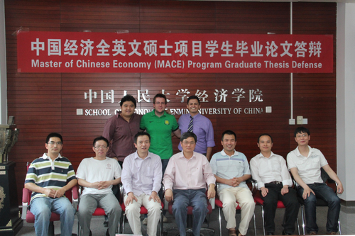 答辩人首先就其论文选题意义及价值、分析方法、论文主要论据、论点及论文结论等作陈述。答辩委员会委员对答辩申请同学论文提问。随后,答辩委员对答辩人的情况进行了总结,肯定了三位答辩同学在论文写作及答辩过程中所作的努力,同时,答辩委员也指出了三位同学论文中的一些不足之处及修改意见。答辩会历经2小时,经答辩委员会最终投票决议,决定授予三名同学硕士学位。h视频 院长杨瑞龙教授、答辩委员会委员及三位学生导师同答辩人一起合影留念。至此,2010级别“中国经济全英文硕士项目”(MACE)硕士研究生论文答辩圆满结束。
