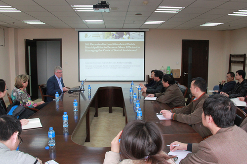 之后,Jouke van Dijk教授在明德主楼734会议室作了题为《Did Decentralization Stimulated Dutch Municipalities to Become More Efficient in Managing the Costs of Social Assistance?》的主题学术报告。报告会由孙久文教授主持,h视频 侯景新教授、付晓东副教授、姚永玲副教授、文余源副教授、虞义华副教授以及部分博士生、硕士生参加了报告会。