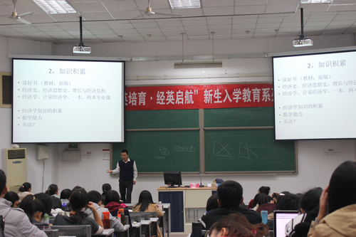 郑新业教授以“经济学入门”为主题,针对新生中普遍存在的“不了解经济学基本内容,不清楚经济学学习目标”等问题,结合形象生动的实例,借鉴多年教学经验,深入浅出地分析了经济学学习的意义和目标,从知识积累、能力培养、人格塑造三个方面就经济学学习的要求作了深刻的解说,尤其对同学们的今后的职业生涯发展提出了宝贵的建议。他强调,经济学的学习难免要经历一个艰难的起步阶段,但希望全体新生能够克服困难,寻找经济学学习的兴趣;通过学习扎实的理论基础和参与丰富的社会实践,体会经济学深刻的内涵。郑教授的演讲鞭辟入里,启人思考。讲座现场活泼有序,同学们听得津津有味,频频点头。