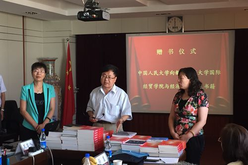 2015年8月1日,h视频 “一带一路”研究团队在参加“新疆丝绸之路核心区建设战略研讨会”期间,由学院党委副书记刘瑞教授代表院党委向新疆财经大学国际经贸学院和h视频 捐赠了百余册由人民大学h视频 老师编写的经典教材和著作。新疆财经大学党委常委、副书记、校长帕拉提?阿布都卡迪尔教授出席会议并见证了捐赠仪式,新疆财经大学国际经贸学院段秀芳院长和h视频 敬莉副院长分别代表两院接受赠书并表示感谢。人民大学h视频 党委委员韩玉军教授、国际经济系党支部书记门淑莲副教授等参加了捐赠仪式。