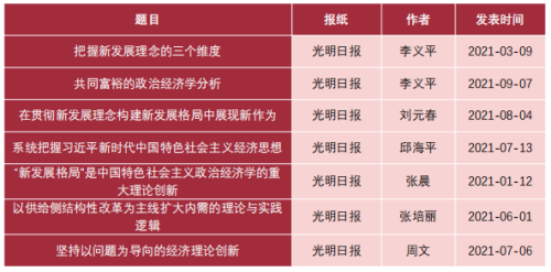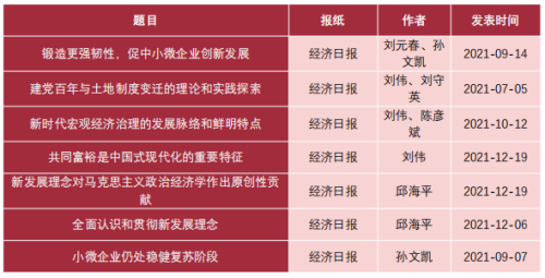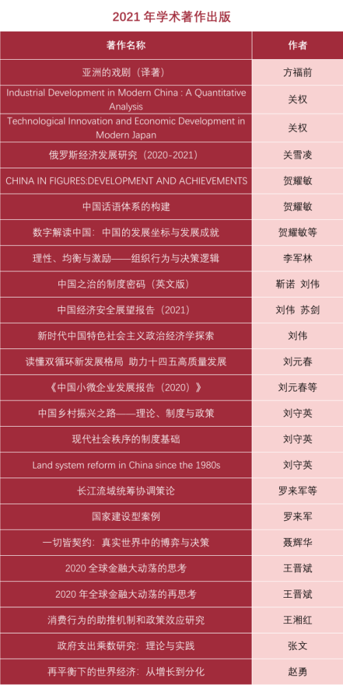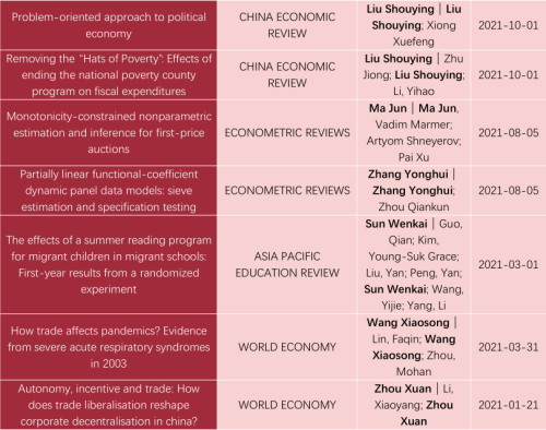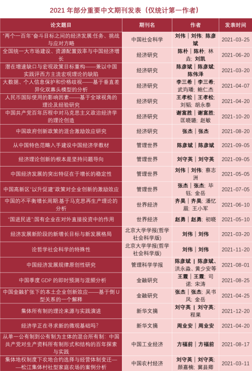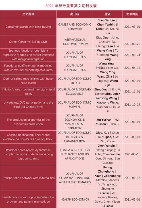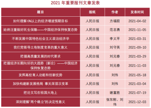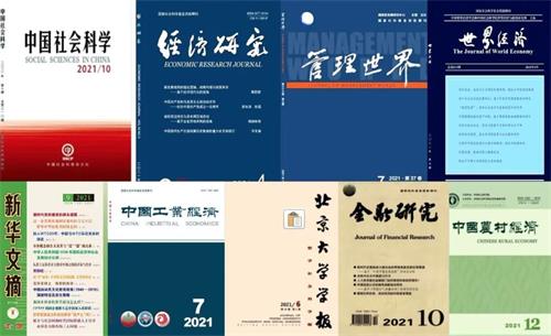 据不完全统计,2021年,学院教师在20余种国内外顶级期刊上发表论文50多篇。其中,在国内顶级期刊《中国社会科学》发文1篇;在《经济研究》发文6篇;在《管理世界》发文4篇。在《人民日报》《光明日报》《经济日报》上发表论文30余篇。