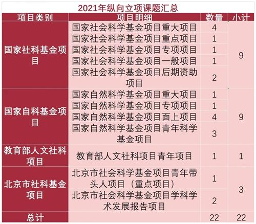 本年度,h视频 教师积极准备各类省部级以上课题申报,并获得22个重要h视频 项目立项。其中,9个项目获得国家社会科学基金项目立项(含国家社会科学基金重大项目立项4个);9个项目获得国家自然科学基金项目立项(含国家自然科学基金重大课题立项1项、国家自然科学基金专项项目立项1个);1个项目获得教育部人文社科项目立项;3个项目获得北京市社会科学基金项目立项(含青年带头人项目重点项目1项)。