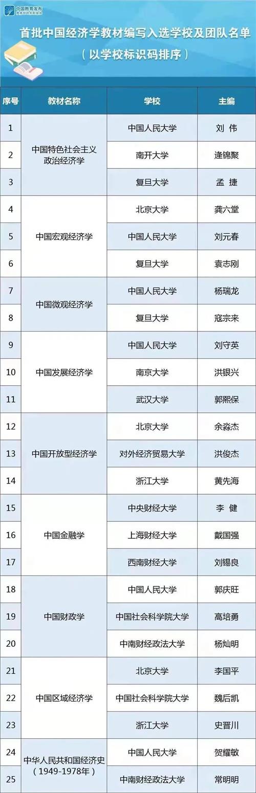 6月,在教育部教材局公示的首批“中国经济学教材”拟入选学校及团队名单中,《中国特色社会主义政治经济学》(团队负责人:刘伟)、《中国宏观经济学》(团队负责人:刘元春)、《中国微观经济学》(团队负责人:杨瑞龙)、《中国发展经济学》(团队负责人:刘守英)、《中华人民共和国经济史(1949-1978年)》(团队负责人:贺耀敏)5本教材成功入选,我校为拟入选教材最多的高校。
