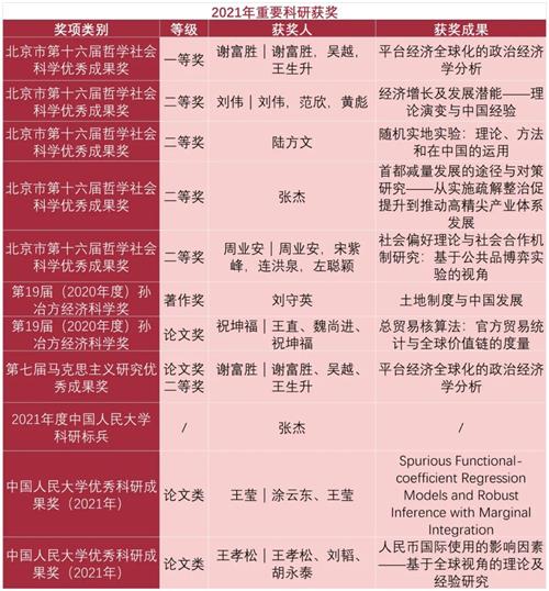 在北京市第十六届哲学社会科学优秀成果奖评选中,5项成果获奖,一等奖1项,二等奖4项;第19届孙冶方经济科学奖,2项成果获奖,著作奖1项,论文奖1项;1项成果获得第七届马克思主义研究优秀成果奖;1位老师获得2021年度h视频 h视频 标兵;2项成果获得h视频 优秀h视频 成果奖(2021年)。
