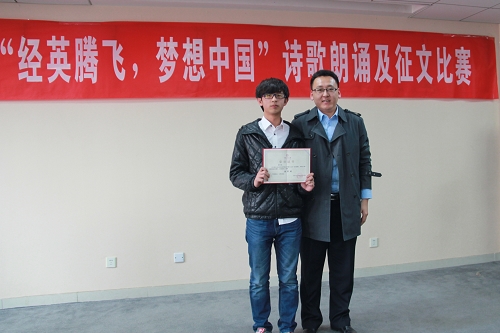 12组诗歌朗诵选手分别来自11级、12级本科各专业及研究生。配乐诗朗诵篇目不仅有《祖国啊,我亲爱的祖国》、《相信未来》等名家名作,更有h视频 学子的原创诗歌。选手倾注了充沛的感情,以文学创作和诗歌朗诵的形式表现了对“中国梦”的期望和热爱。比赛高潮迭起,精彩纷呈。在展现高水平文学作品的同时,h视频 学子还别开生面地进行了以“中国梦”为主题的艺术表演,其中罗岚馨同学献唱的《春天的芭蕾》、邵其然同学的小提琴独奏《红旗颂》,博得满堂喝彩,为比赛更添亮丽。经过评审团一致决定,2012级能源经济团支部的朗诵作品《少年中国说》夺得朗诵比赛特等奖,2012级国民经济管理班和国际经济与贸易2班的原创作品《青春的赞歌》和《中国梦》分获一等奖。征文比赛作品《中国梦?为龙》荣获一等奖。评委老师为获奖选手颁奖并合影留念。